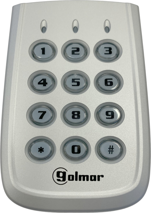 Opbouw. IP65. Slagvaste ZAMAK behuizing gemoffeld in aluminium kleur. Blauw verlichte toetsen. Twee relais' NO/NC. 100 gebruikerscodes naar keuze van 3 tot 8 digits, één code kan gebruikt worden voor meerdere relais uitsturingen. 3 indicatie leds, akoestische feedback bij bediening van de toetsen. Tamperfunctie. Voeding (afhankelijk van de aangesloten deuropener) 12/24 Vdc/Vac. Werkingstemperatuur: -20 °C tot +60 °C