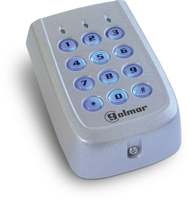 IP65. Kunststof behuizing in aluminium kleur. Blauw verlichte toetsen. Twee relais' NO/NC. 100 gebruikerscodes naar keuze van 3 tot 8 digits, één code kan gebruikt worden voor meerdere relais uitsturingen. 3 indicatie leds, akoestische feedback bij bediening van de toetsen. Tamperfunctie. Voeding (afhankelijk van de aangesloten deuropener) 12/24 Vdc/Vac. Werkingstemperatuur: -20 °C tot +60 °C