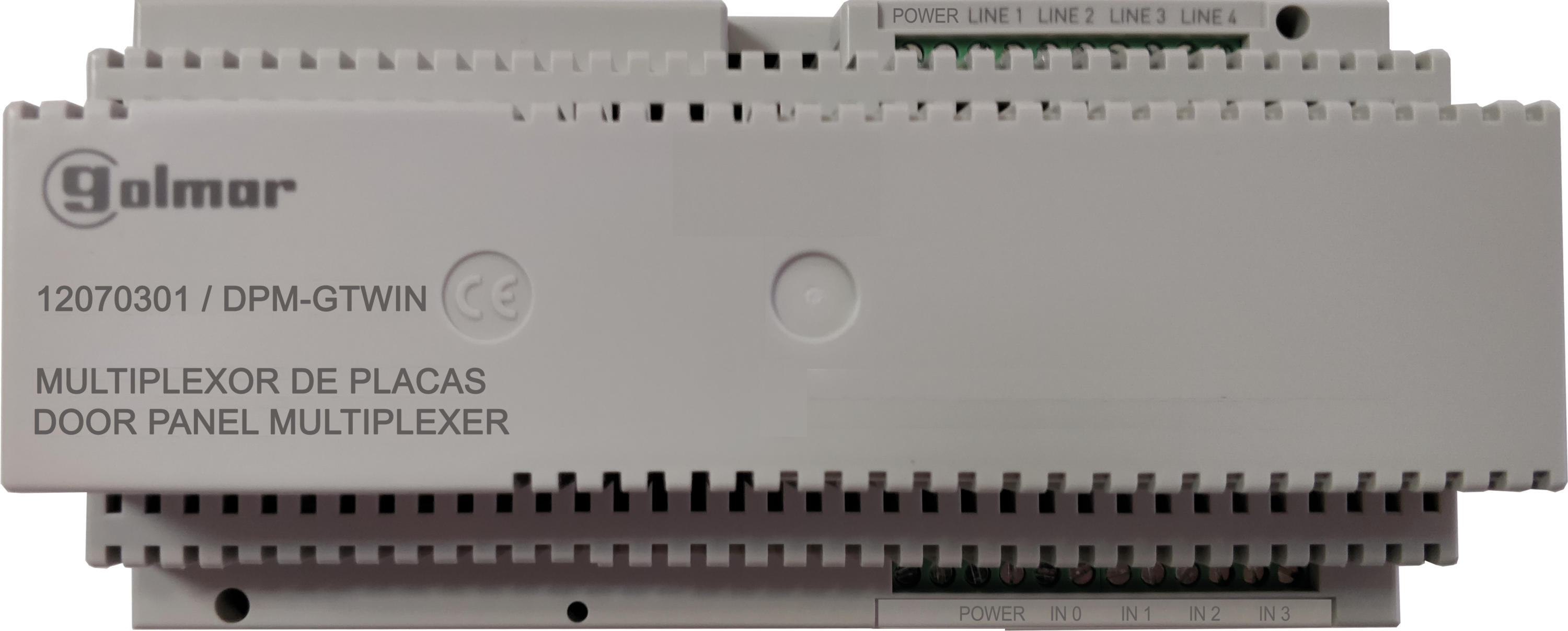Vier ingangen voor het koppelen van camera-spreek-luister panelen. Vier uitgangen voor strengen.