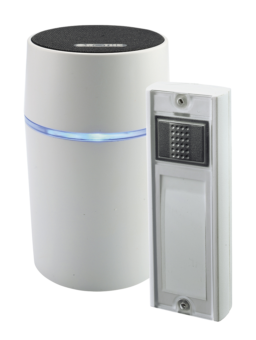 Tafelmodel. Zendbereik tot 500 meter*. 83 dB. 13 melodieën en LED ring met kleurkeuze. Inclusief zender SE03, te bedraden vanuit de monitor. Voeding zender: 2 x AAA batterij. Voeding gong: 4 x AA batterij. Batterijen niet meegeleverd!