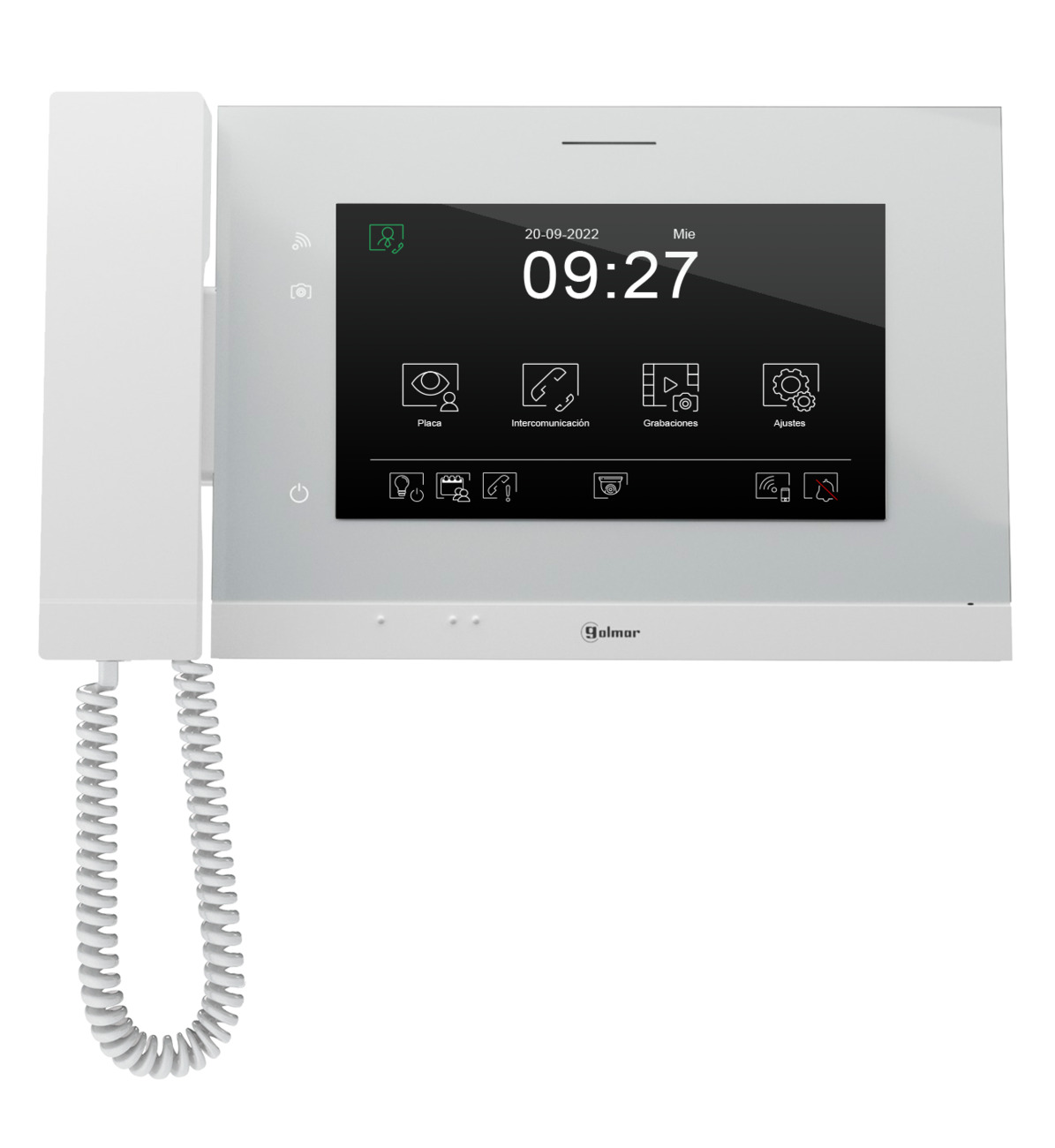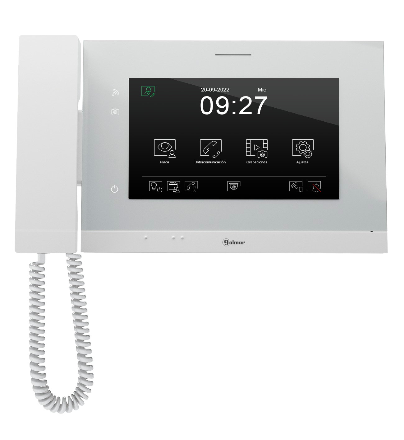 Wandmodel opbouw, inclusief montageplaat. Telefoonhoorn. Duotone wit. WiFi on-board voor call-forwarding naar gratis G2Call app op smartphone & tablet, WiFi - 4G - iOs & Android. 7" touchscreen én soft-touch toetsen, backlighted bij bediening. Instelbare taal. Spy, zelf-oproep, gemiste oproepen. Persoonlijke achtergrond en persoonlijke beltoon.