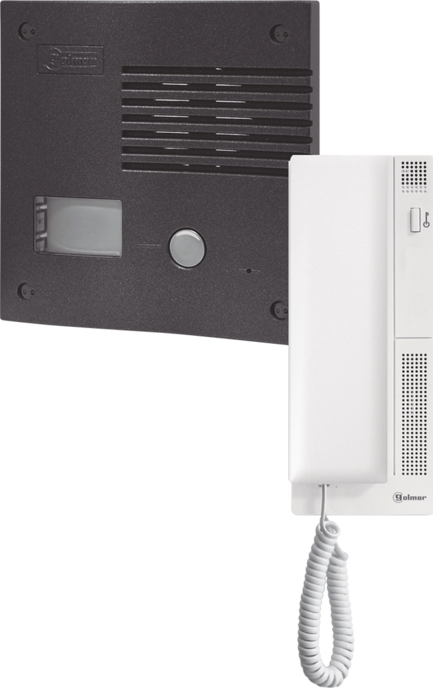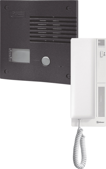 Bestaande uit; robuust (IK09/IP44) inbouw spreek-luister paneel PE-295/1 GRF met één beldrukker, één telefoontoestel T-500 en een trafo TF-104