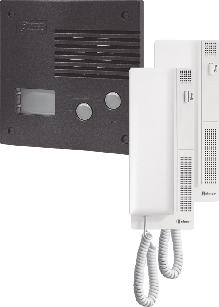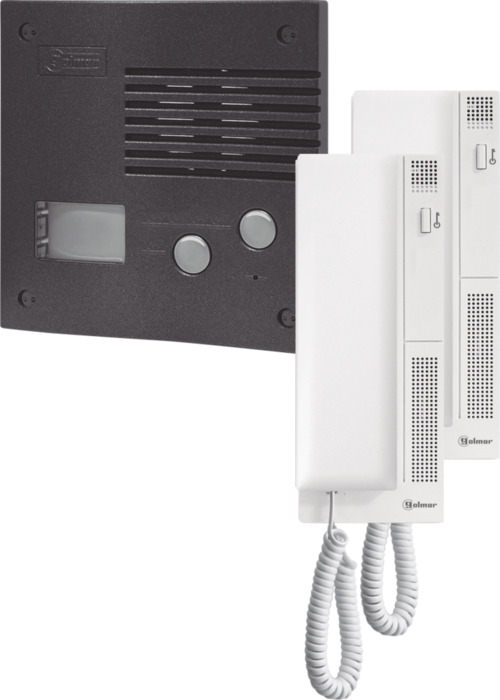 Bestaande uit; robuust (IK09/IP44) inbouw spreek-luister paneel PE-295/2 GRF met twee beldrukkers, twee stuks telefoontoestel T-500 en een trafo TF-104