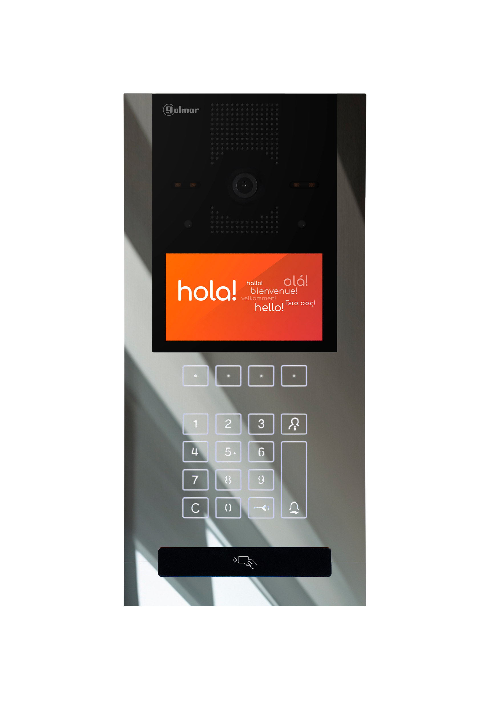 RVS gepolijst front van 5 mm | Inbouwdoos CE-6502 SE niet meegeleverd | Opbouw zonder inbouwdoos te hoeven gebruiken met de optionele S7165 SE | IK07/IP65 | Een inbus montageschroef via onderzijde, speciale schroevendraaier meegeleverd | Aluminium toetsen met achtergrond verlichte symbolen | Meertalige GUI | Thermische bewegingssensor voor activatie van het scherm als een bezoeker voor het paneel staat | Camera met wide angle lens (130°) | Ondersteunende witlicht leds | Compleet geprogrammeerd en geconfigureerd geleverd | Beheren, muteren en updaten (a) met de webbased manager via het LAN of (b) in de cloud via het GOLMAR web-portal | Koppelen van een extra (overzicht) camera direct op het codepaneel