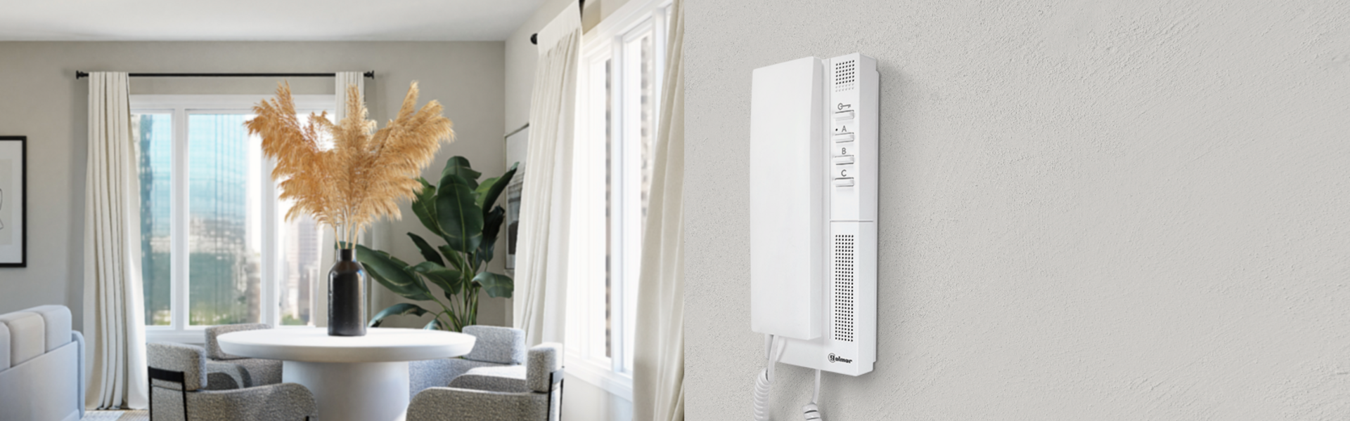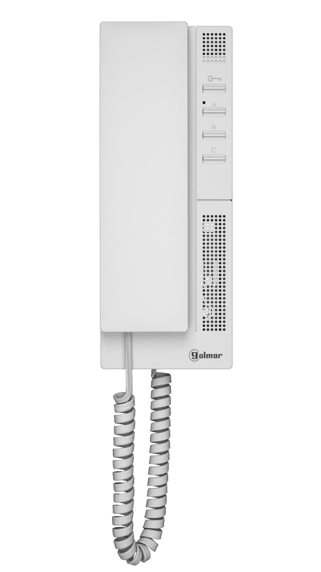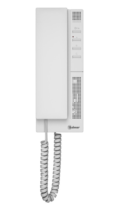 Wandmodel. Opbouw. ABS met licht profiel in RAL9003 (signaalwit)), vanaf V03 gepolijst. Verschillende systeem-gebonden oproepsignalen voor herkenbaarheid van de oproep. Deuropener toets, meerdere vrij te programmeren optietoetsen.